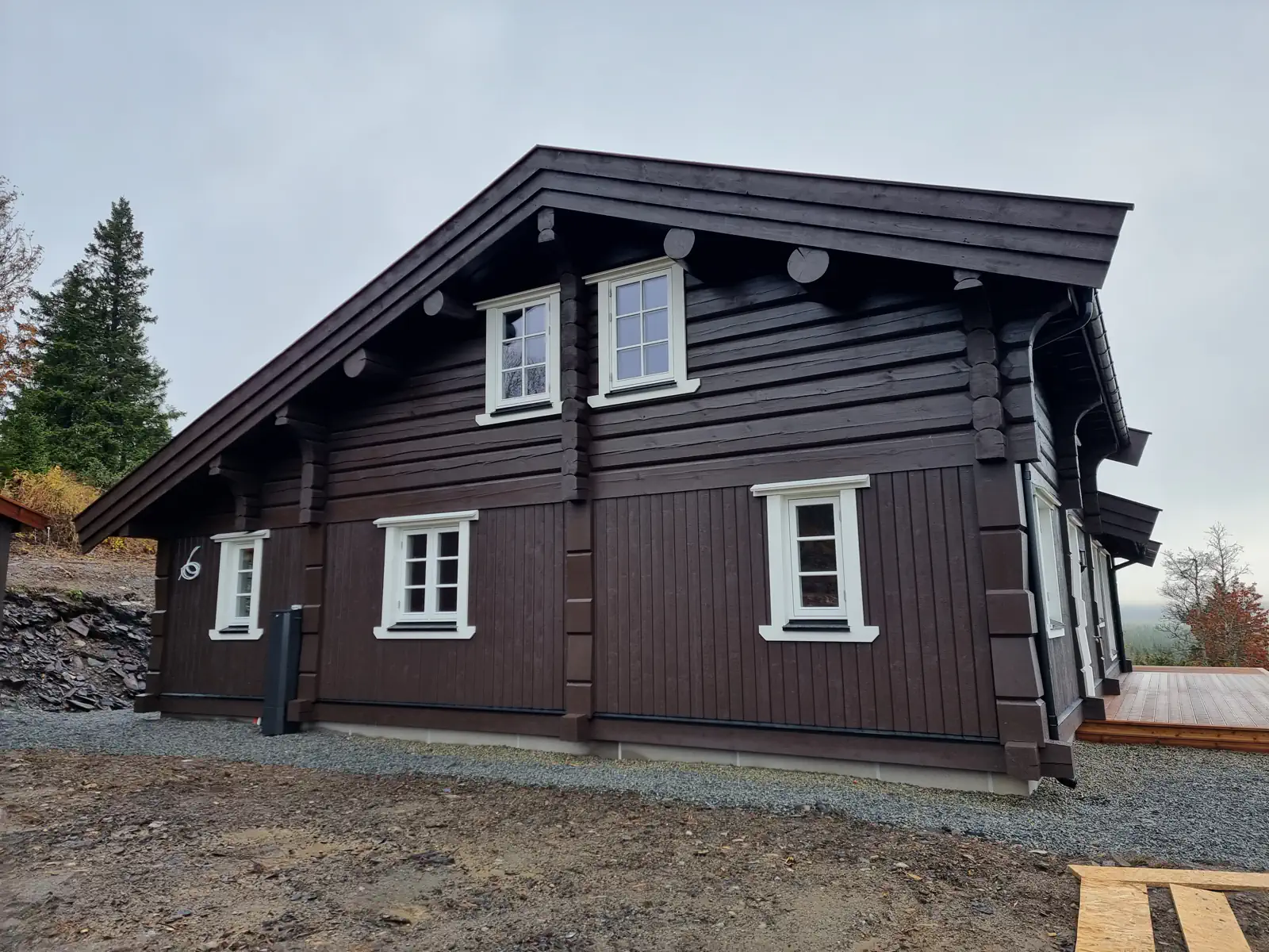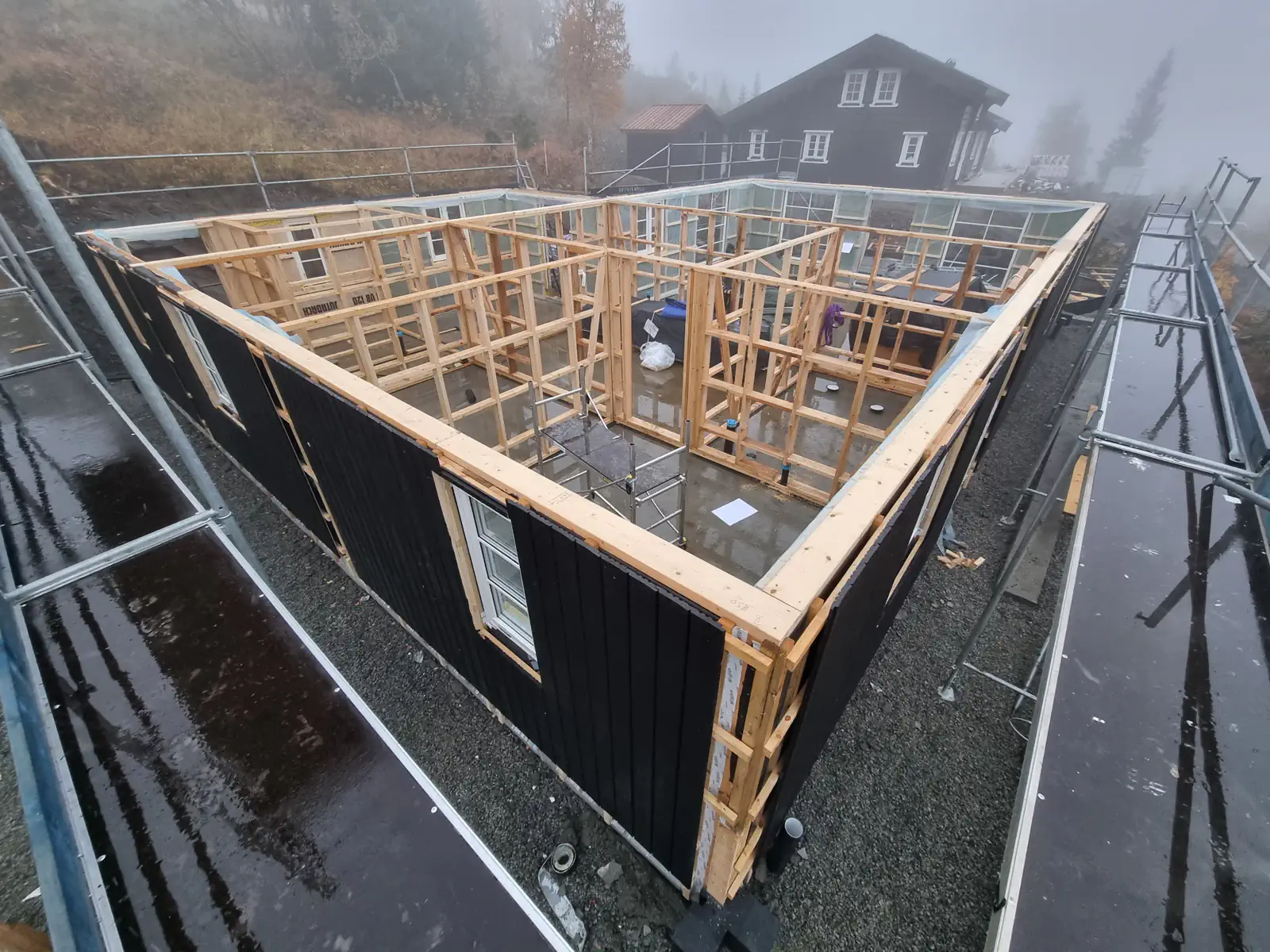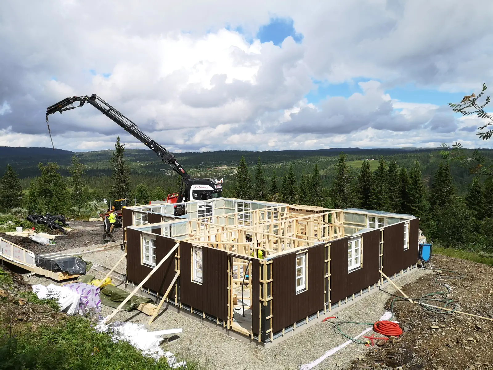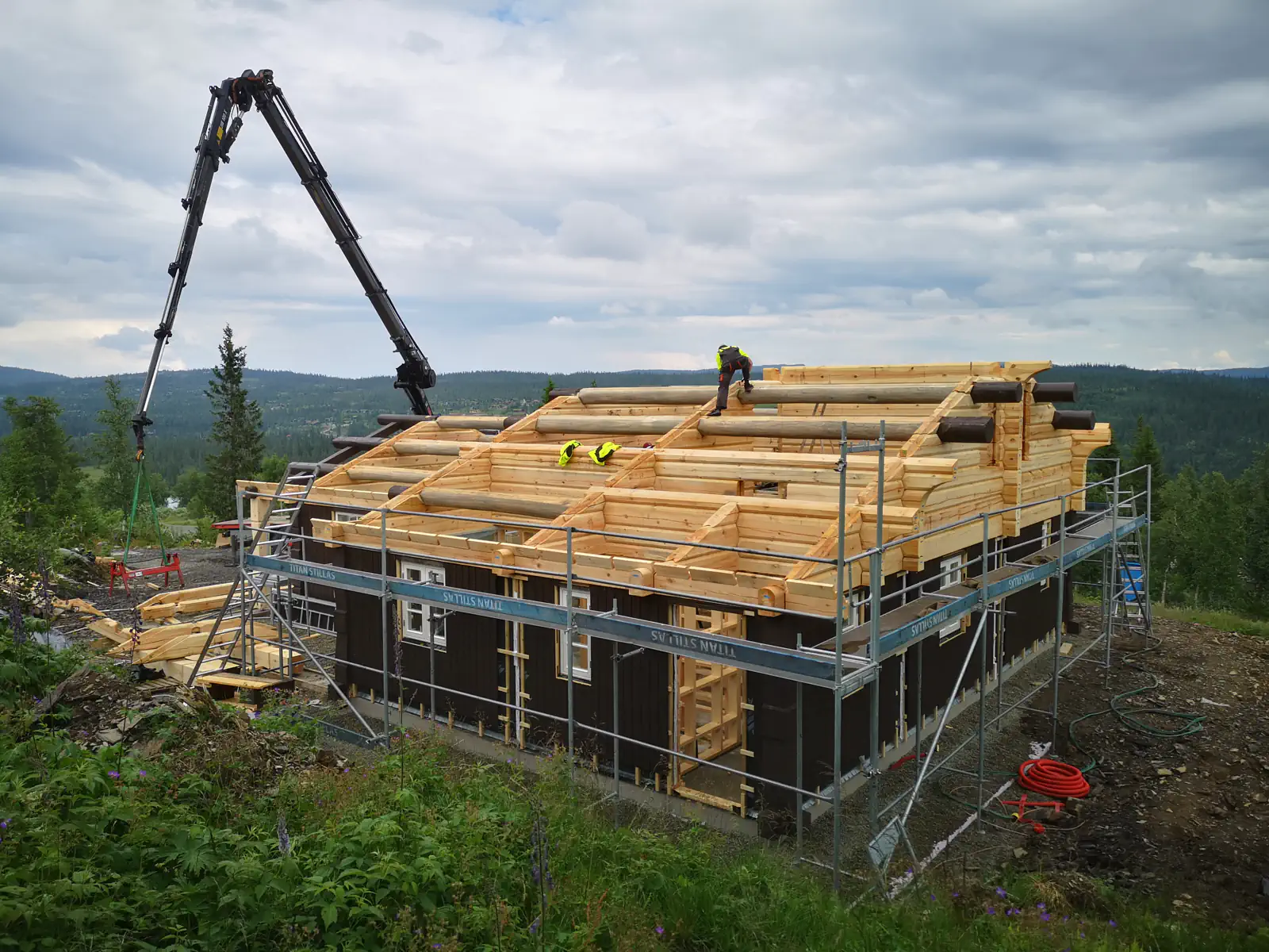 Timber Kit-teamet var involvert i alle stadier av prosjektgjennomføringen, fra produksjon av treramme og tømmerhuselementer i fabrikken vår til montering og etterbehandling på stedet.